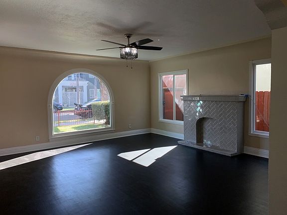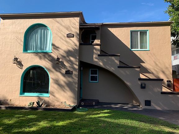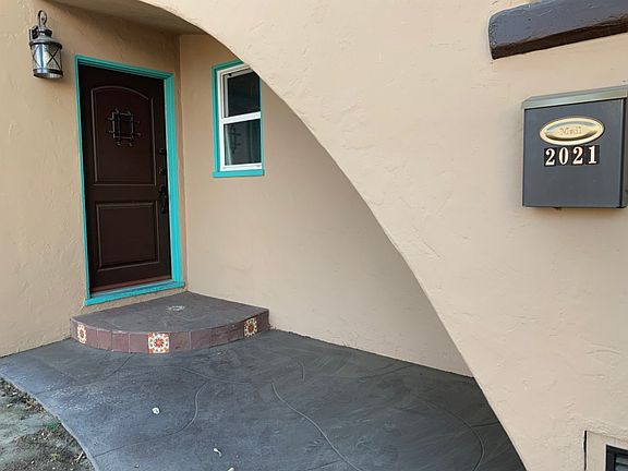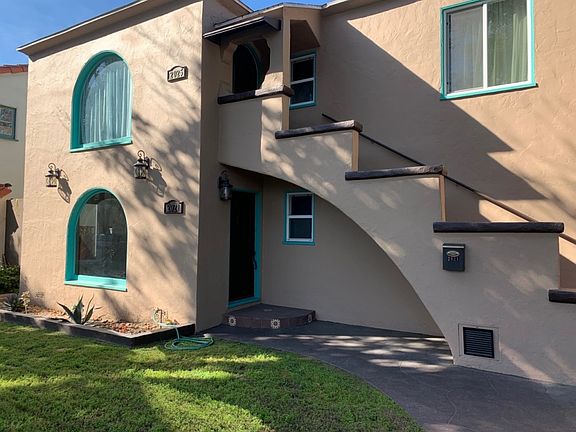 Lower unit of this charming Spanish duplex. Arched entry door opens to beautiful wood floors in a spacious living room highlighted by a classic picture window and mock fireplace. This home has formal dining adjacent the remodeled kitchen which features stainless gas stove, dishwasher, built-in microwave, tons of cabinet space and quartz counter tops. Refrigerator is included. An inside laundry area comes with a full size washer and dryer. Both bedrooms have nice closets and ceiling fans. The bath has dual sinks and attractive porcelain tile. There's A/C units in each bedroom as well as in the main living area. In addition, dual pane windows are installed throughout the home, and the hot water is supplied by a tankless water heater. The common space backyard is huge and has a large grass area. Includes parking with a one car garage space and one parking pad behind it. A definite rare find!