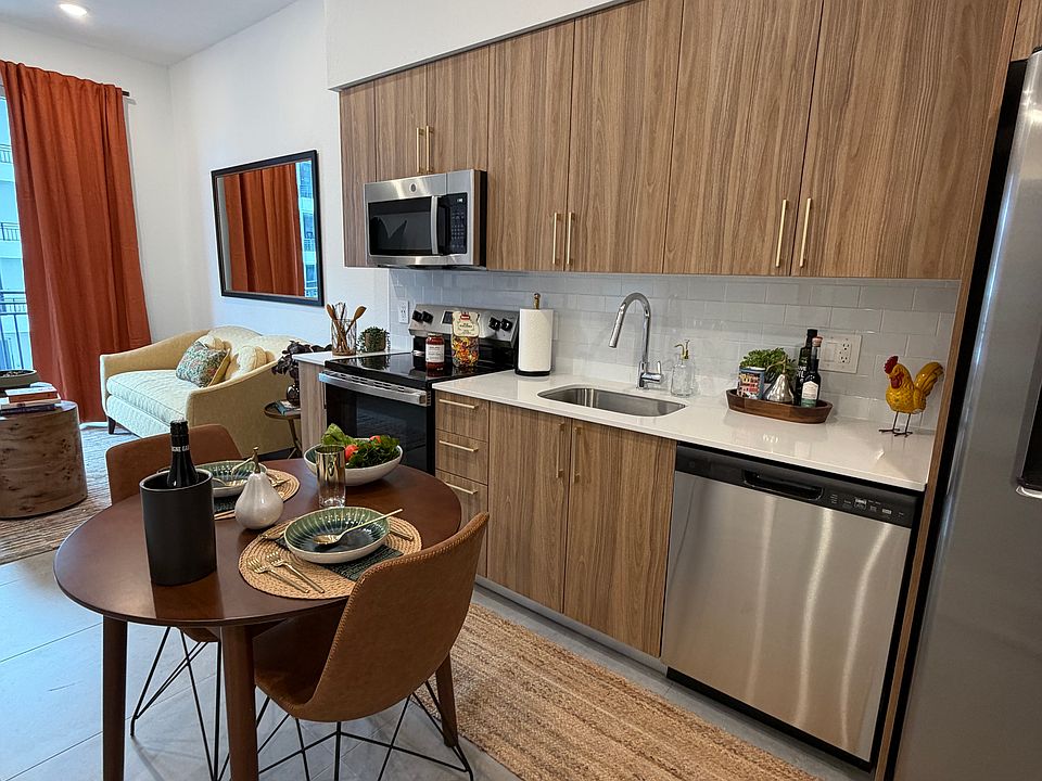 The 1 bed - 1 bath apartment offers spacious rooms with plenty of space to move comfortably. All the features of your future home have stainless steel appliances, walk in closets, high quality Italian kitchens and cabinetry, washers and dryers. The finishes include new granite countertops with ceramic ivory tile flooring.