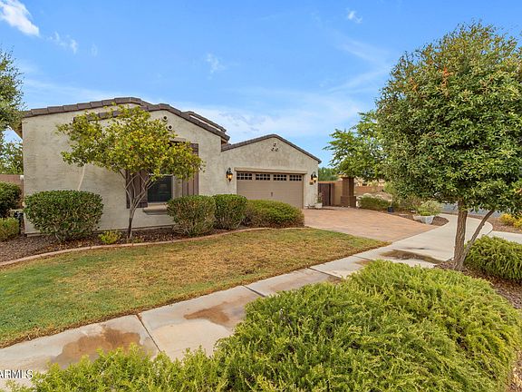 Charming 3-Bedroom + Den Home in Prime Queen Creek Location. This single-story home, built by Meritage Homes, is situated on a cul-de-sac with neighbors on only one side. The property features a paver driveway with an extension and a north-facing backyard. Inside, you'll find a spacious great room with ceramic tile flooring and neutral paint throughout. The large kitchen island and stainless steel appliances add to the modern feel of the beautiful kitchen. Large primary bedroom with walk in closet and ensuite bathroom with separate shower/tub. Huge double sliding door in the greatroom opens to a covered patio, perfect for outdoor living. Located in the Victoria Community which is walking distance to Queen Creek Marketplace and close to the growing downtown Queen Creek area