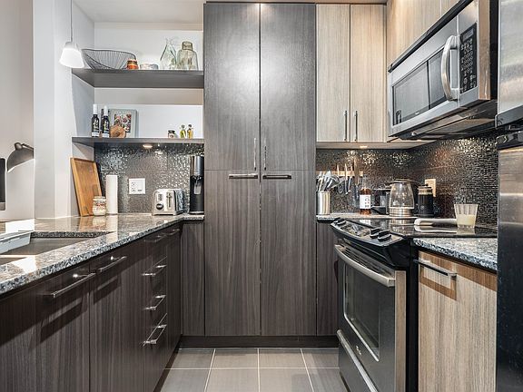 Welcome to Elements, located in one of Langley’s most sought-after communities. This bright and modern 1-bedroom home features an open-concept layout with 9-foot ceilings, oversized windows, and stylish wide-plank flooring. The gourmet kitchen boasts granite countertops, stainless steel appliances, elegant cabinetry, and a spacious island perfect for entertaining. The living and dining areas flow seamlessly to a covered balcony, offering a peaceful outlook. The bedroom is spacious and inviting, and the bathroom showcases quality finishes with stone countertops and tile flooring. Residents have access to exceptional amenities, including a fully equipped gym, yoga studio, clubhouse lounge, party room, kids’ playroom.