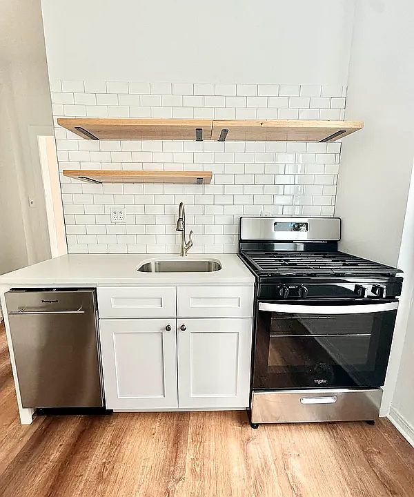 Walk-thru your welcoming front door sits the lovely first bedroom with great closet space. Down the hall is the other bedroom which is right next to the lovely and spacious living room. Next to this area is a windowed chefs kitchen with brand new stainless steel appliances including dishwasher and loads of counter and cabinet space including reclaimed wood floating shelves.