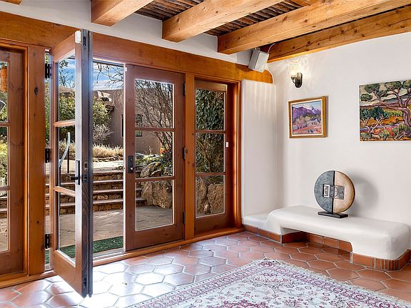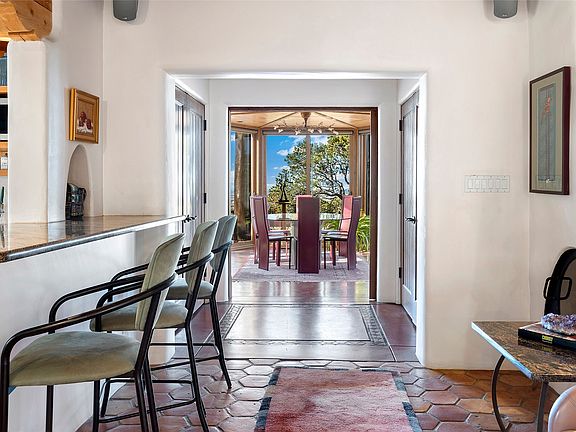 The Rocky Mountains stretch for 3,000 miles from Canada to New Mexico, taking their final shape in the Santa Fe foothills. 2022 Foothills Road is a fitting property to encapsulate the significance of this terminus, where the great mountains meet the special character of our town. The property comprises a 2-bedroom main house, a 2 bedroom casita, and an additional studio casita on 1.6 acres overlooking City lights below. The main house blends traditional puebloan design — substantial rounded plaster walls, wooden vigas and latillas, and kiva fireplaces with modern proportions and touches of calming Japanese accents. The main level has a large primary suite with an updated bathroom, formal and informal sitting rooms, a secluded sunroom with a backdrop of a lush pond, and an indoor therapy pool room. Also on the main level is a light-filled kitchen wrapped with windows and featuring custom wooden cabinetry, a farmhouse sink, stone and wood countertops, and open display shelving that add warmth and architectural character. The showpiece of the main house is the glass-walled dining room that sits like a peninsula on the western edge, capturing expansive views of Santa Fe and the plains beyond to the Sandia Mountains in the south and sunsets atop the Jemez Mountains in the west. On the second level, exceptional views are further elevated. This upper story includes two rooms sharing a full bathroom, lending themselves as bedrooms or offices. On both levels, there is a powder room for guests. Regardless of the use, these rooms frame open skies as far as the eyes can see. Separate from the main house is the sized casita with 2 bedroom suites, and living area. Attached to this casita is the studio casita, an open and high-ceilinged room inviting the owner’s creativity. The space can be used as an art studio, private work space, or a rentable living space as it features a kitchenette and bathroom. Finishing off the improvements is a large 2-car garage with extra storage space.