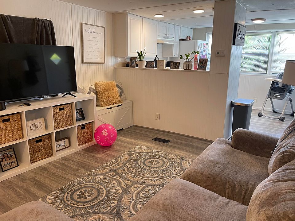 Well-maintained 2/1 trailer in a quiet and friendly neighborhood! Freshly painted with brand-new flooring, light fixtures, cabinetry, and more. Adjustable lights with 5 lighting settings, from warm to bright white, to meet your needs. Washer and dryer hookups and storage shed. Large backyard on the water, two side yard spaces for extra hangout space, and a large screened-in patio.