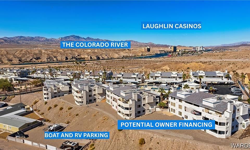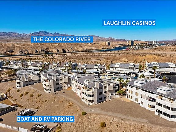 POSSIBLE SELLER FINANCING...SHORT TERM WITH SIZEABLE DOWN. DARLING 2 BEDROOM, 2 BATH UPPER LEVEL CONDO WITH TWO BALCONIES IN THE POPULAR RIVERVIEW BLUFFS. EXISTING FURNITURE CAN STAY. HOME FEATURES BRIGHT OPEN KITCHEN WITH BREAKFAST BAR DINING. SPACIOUS LIVING ROOM WITH WOOD BURNING FIREPLACE. LARGE PRIMARY BEDROOM. PRIMARY BATHROOM BOASTS DUAL SINK VANITY, LARGE TUB/SHOWER COMBO. GOOD SIZED GUEST BEDROOM WITH SLIDING GLASS DOOR TO BALCONY WITH VIEWS OF THE POOL. GUEST BATHROOM HAS WALK-IN SHOWER. LARGE STORAGE CLOSET IN ENTRY WAY AS WELL AS ONE ON THE SIDE BALCONY FOR EXTRA SPACE! EACH UNIT COMES WITH IT'S OWN COVERED PARKING SPOT AND THERE'S PLENTY OF OVERFLOW PARKING. AND, IF AVAILABLE, THERE IS FREE FENCED RV/BOAT PARKING (TALK TO HOA). COMMUNITY IS ACTIVE AND HAS TWO POOLS (ONE SOLAR HEATED YEAR- ROUND), SPA, CLUBHOUSE WITH KITCHEN, DOG PARK. HOA COVERS TRASH, BASIC CABLE, POOLS, SPA, BBQ AREA, CLUBHOUSE, GATES, COMMON AREAS, LANDSCAPING, EXTERIOR MAINTENANCE, ROOF. NO SHORT TERM RENTALS ALLOWED...90 DAY MINIMUM. TWO PETS ALLOWED...NO WEIGHT LIMIT. JUST A STONE'S THROW FROM THE LAUGHLIN CASINOS, LAKE MOHAVE, SHOPPING, DINING, MEDICAL...AND THE PRISTINE COLORADO RIVER!