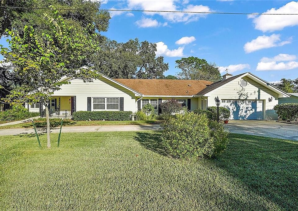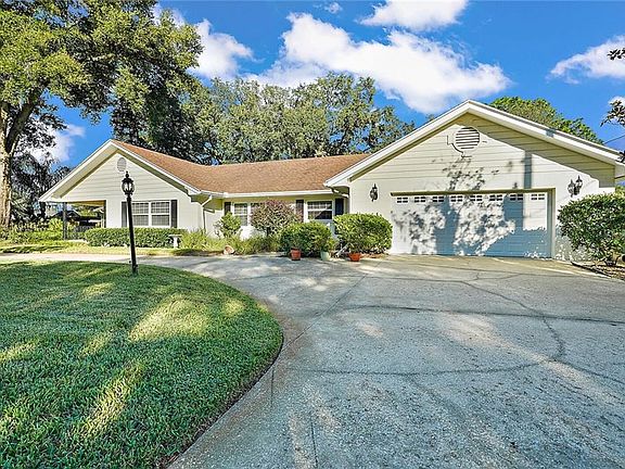 Be inspired by the beauty of this MOUNT DORA ranch style POOL home near LAKE GERTRUDE only minutes from the highly sought after downtown district. Nestled on an extra wide lot which allows for a circular driveway providing lots of off street parking in the hills of Mount Dora, you just can't beat the integrity of this home. It is very well maintained and has stood the test of time featuring concrete block exterior construction, enclosed two car garage and accessible approach to front door, garage and back open patio. Every living space is roomy, light and trimmed with crown molding. The kitchen has plenty of counter space, window over sink, moveable island and TWO OVENS with separate broiler units. Real brick surrounds the coffee/wet bar in the dinette just off the kitchen. There is a real nice size laundry room with closet and additional storage plus a full bath great for coming in from the pool or outside. The view from the family room overlooks the the back lanai, pool/spa and lush landscaping. Warm up on those chilly nights in front of the corner brick fireplace. And while you have that going on, others can enjoy the front living and dining space for those special sit down meals and wonderful conversations. Each living area provides privacy and comfortability. Shelving built-ins are located in the kitchen, dinette, family room and third bedroom currently used as HOME OFFICE. Items such as the: roof, windows, HVAC, appliances, kitchen cabinet doors, color-crete exterior , hot water tank have been replaced during current ownership. If it broke or wore out, they fixed or replaced it. Special features like the vertical shiplap and plate/picture shelf in the family room are not found in newer homes. The pool is a perfect size and includes a bubbly spa seating area. Outside of the pool and lanai is a large open patio great for entertaining, BBQ grill or raised bed gardening. You won't get your feet dirty by using the sidewalk leading around the garage and open patio. Beautiful curb appeal and landscaping with separate meter irrigation. Gas fed hot water tank, fireplace, cooktop, ovens and furnace. Good storage in each bedroom, coat closet, hallway closet, kitchen, laundry room and garage. No HOA.