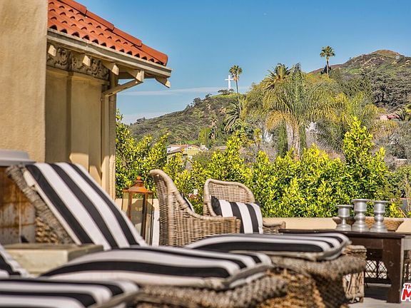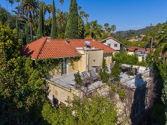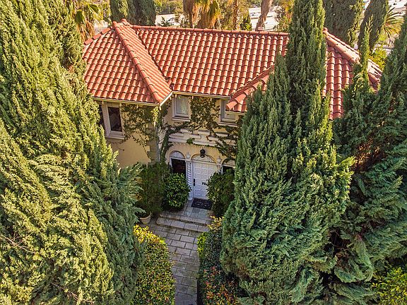 A rare offering in the historic enclave of Whitley Heights, this 1920s Mediterranean residence embodies the romance of old Hollywood reimagined for modern living. Set behind gates and surrounded by mature greenery, the home offers privacy, tranquility, and timeless architecture just moments from the heart of the city. The main level unfolds with a grand living room framed by soaring ceilings, original crown moldings, and arched windows that bathe the interiors in natural light. A formal dining room with built-ins opens to a sunlit kitchen appointed with a gourmet range, Sub-Zero refrigerator, and breakfast nook overlooking the gardens. A home office, guest room or den, and full bath complete the level. Upstairs, two bedrooms and a full bath connect to a rooftop terrace capturing panoramic views of the Hollywood Hills and skyline beyond. On the lower level, a fully private two-bedroom guest suite with its own entrance offers a full bath, living room, and laundry ideal for extended stays, a studio, or creative workspace. Designed for both entertaining and everyday ease, the property's outdoor spaces are a natural extension of the home. Terraced gardens, shaded patios, tranquil fountains, and a koi pond create a setting of rare serenity and character. With 5 bedrooms and 3 baths , this residence honors its historic roots while offering the functionality and flow of modern design. Located within the Whitley Heights Historic Preservation Overlay Zone one of Los Angeles' most architecturally significant neighborhoods this is a true sanctuary of history, artistry, and timeless style.