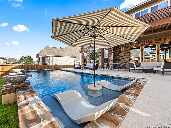 This David Weekley home offers a rare mix of comfort, function, and style. From the moment you arrive, the attention to detail and thoughtful design are clear. The home sits on a generously sized lot, allowing for both a stunning outdoor living space and a grassy backyard perfect for play or relaxing in the sun. A modern, clean-line pool with decorative fountains and a lounge area creates a private resort feel. The outdoor kitchen and oversized covered patio offer an ideal setting for entertaining year-round. Inside, the home continues to impress. Rich wood floors extend throughout the downstairs living areas, adding warmth and character. The chef's kitchen is the heart of the home, featuring an oversized island with plenty of seating, modern appliances, and abundant prep space. It's designed for cooking and gathering. Just off the living room, a fireplace adds a cozy touch for cool evenings. At the front of the home, a dedicated office offers a quiet space for work or study. The primary bedroom is tucked away on the first floor for added privacy. This owner's retreat is spacious and calming, with a stand-alone shower, a garden tub, and a layout that feels like a private spa. Upstairs, the home continues to offer flexible living. A large loft area can be used as a movie room, game room, or even host a pool table. Additional guest bedrooms are located on this level, providing privacy for visitors or space for a growing household. The three-car garage adds storage and convenience, rounding out the home's well-planned layout. This property brings together everyday comfort and standout features that make it truly one of a kind. Welcome home!
