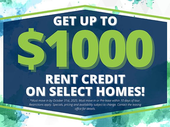- Special offer! Get up to $1000 rent credit on select homes! *Must move in by October 31st, 2025. Must move in or Pre-lease within 10 days of tour. Restrictions apply. Specials, pricing and availability subject to change. Contact the leasing office for details.