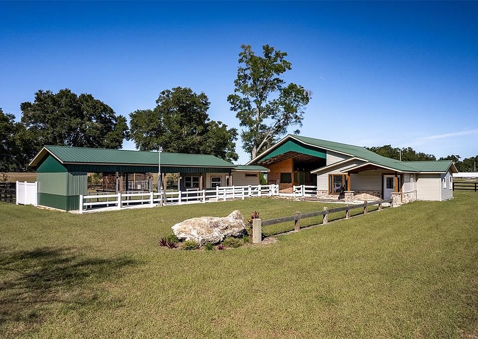 This is a rare find property that offers so much! Overall Features List Equine Center/Farm; located in Marion County, Horse Capital of the World 20221 SW 5th Place, Dunnellon, FL 34431 13.66 acres total property, zoned A1 Agricultural Residential Structures, Barns, and out buildings equal to 2.32 acres. 5 Pastures/Paddocks of lush Marion County soil equal to 11.34 acres.667 Feet of Frontage on Paved SW 5th Place just west of Hwy 41 World Equestrian Center 14 Miles East; HITS Horse Show in the Sun 15 miles East. Individual Features List Show Barn (63’x64’, 4032 sq ft) has a 14’ wide Center Isle. Metal Roof. 12’ overhead door. 8 high quality 12’x12’ stalls with high quality steel doors and tongue and groove pressure treated wood and one piece of matting in each of the 8 stalls. Horse Care Center: (20’x67’, 1340 sq ft) is attached to show barn with a covered walkway, includes 4 equine service bays, a bathroom, and a large tack room with a window viewing area of the service bays. The service bays (aka educational labs) were designed, engineered, and built for veterinarians, equine dentists, holistic veterinarians, massage therapists, farriers, equine groomers, and educators. Barndominium: attached to Show Barn is 1026 sq. ft., with one bedroom and two baths. Quality light fixtures, windows, and excellent lighting. Stainless Appliances. Granite Counters. Open concept. Warehouse building: 36’x72’ with 6 bays; 3 bays have 12’ Overhead doors with concrete flooring. 3 bays are designed for large equipment, bedding, and hay storage. Two Run-in barns: located in pastures, each with two 12’ x 12’ stalls. Residence: Fleetwood Mobile home with separate fenced yard. 24’x48’ 1152 sq ft built in 1994. 3 Bedrooms, 2 Full Baths. 2023 renovation included new ac, new septic, new bathrooms, flooring, windows, new siding, and new insulation. Also, 2 wonderful porches to admire the grounds and solitude. Comes furnished. RV Sites: Two sites set up for 50/30/20 power, water, septic, and Starlink internet. One site includes a 2013 Eagle by Jayco RV, 28.5’ 5th wheel with awning, currently used by the gatekeeper/maintenance man who will consider continuing with new Buyer. Designed as an Equine Education Center, this property is ideal for peaceful farm living. Ideal for the Buyer who wants beauty, serenity, and a very functional clean farm set up that is designed for efficient animal care, boarding, or showing. Room for improvements to your requirements such as round pen, show arena, jumping or training hurdles. Even your dream home. Ideal for Horse Farm, Equine Education, Canine Training Boarding, Veterinarians. Please call to make your showing appointment today!