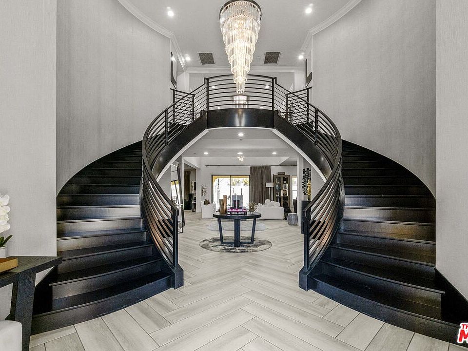 Gorgeous Contemporary Home with ebony wood Dual Stairs - This extraordinary home is from the esteemed Palisades Collection in Porter Ranch exclusive Westcliffe community. Experience the glamour of SoCal living with a wrap around backyard featuring a basketball court and swimming pool. This beautiful, sophisticated open floor plan home has two floors with 5,492 sq ft, 5 Bedrooms, 5 bathrooms, a spacious loft, movie room and office. Once you enter through the oversized front door, you're met by a stunning chandelier, designer wall paper through out and two beautifully designed custom staircases on each side of the foyer leading up to the primary and guest bedrooms. The great room, adorned with 10 feet stackable doors, a double-height ceiling, and huge double pane windows through out. Prepare to be inspired in the striking gourmet Chef's kitchen, which features oversized quartz countertops and tile backsplash, an expansive eat-in center island, top-of-the-line Wolf and SubZero appliances, a walk-in pantry, drop zone from the garage and stunning herringbone tile floors. Lots of natural light with expansive glass doors and windows, beautiful color scheme. The huge primary/master bedroom includes a retreat (great for an office or sitting area), his and hers separate closets, an exceptional ensuite bathroom with spa enhancements and linen close. Generous 2nd floor bonus room and 2 junior primary suites with private bathrooms. TWO private balconies on the second level with full city and mountain views. The outdoor area features a gas fireplace, built-in BBQ, basketball court and pool. This spectacular home is situated very high up in Porter Ranch Hills, on an oversized flat lot, in the very exclusive and highly sought-after guard gated community of Westcliffe. This community is private and affluent, boasting newly built, opulent estates, behind a guarded gate entrance. SOLAR OWNED!! Conveniently located near the new "Vineyards" shopping complex, with an AMC luxury cinema, Whole Foods, Nordstrom's Rack, award winning schools and close to the 118 freeway. Home also feature: elegant custom drapery, window shades, solar, storage cabinets in garage, security cameras & more!! MUST SEE NOW! Make sure to check out the Virtual Walk through of this lovely home!