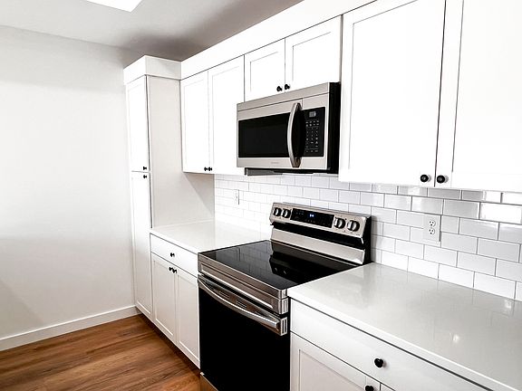 Stainless steel appliancesModern unitQuartz countertopsWasher and dryer hookupsVinyl plank flooringWalk-in closet