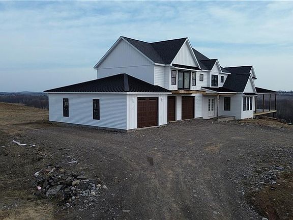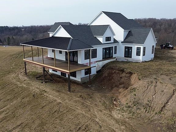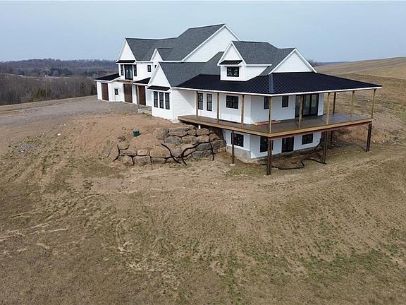 Modern farm house with over 4,100 sqft just waiting for your finishing touches! This gorgeous home is sitting on 3.37 Acres with breathtaking views! This Luxury build includes: all-black Anderson doors and windows, massive 4 car garage with 9 foot custom garage doors, shop heat and plumbing, 2 tankless water heaters, 2 furnaces, wide open 15 course basement with windows/sliding glass door and metal/asphalt roof! HUGE upper deck and warp around porch are completed with lifetime warranty composite decking. Second floor balcony right off the bonus room/ 4th bedroom. Selling as is or can be finished at an agreed upon number. Once in a lifetime opportunity to own a property that has been in the family for over 100 years!! Just minutes from the village, hospitals and shopping!