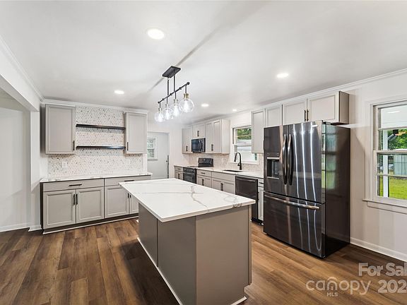 Take a stroll down Garland Avenue to check out it's newest remodeled ranch featuring white brick with black accents and a striking red front door. Once you enter the front door you will immediately notice the open concept living room & kitchen with brand new LVP throughout. This chef's kitchen is complete with quartz countertops, black stainless steel appliances, tons of storage, an island, and coffee bar! Fresh neutral paint throughout and re-finished hardwoods down the hall and throughout all three bedrooms. The primary bedroom and stunning en-suite bathroom are perfect for privacy. The spacious backyard is fully fenced in and complete with a shed - it is the perfect area for gardening, outdoor activities, or relaxation. Only five minutes away from the hustle and bustle of all that downtown Gastonia has to offer, including shopping, dining out, breweries, and more!