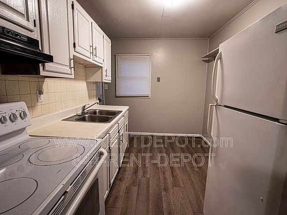 This home is just a few short minutes drive from shopping, schools, and the rest of the city. Fall in love with this 3 bedroom/1 bathroom house for rent. This home includes a fenced in front yard and a large backyard. It has durable laminate hardwood flooring throughout, a washer/dryer hookup off the kitchen, and newer window treatments.