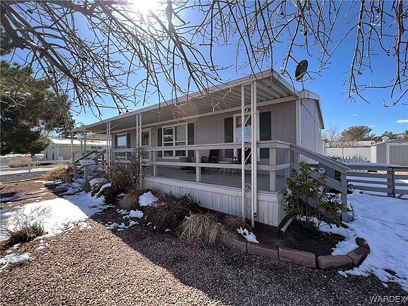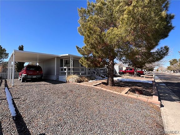 Must complete an application to the AAA park prior to purchase. #3 is a beautiful 3 bedroom, 2 bath, all electric double wide with open living and a spacious well appointed kitchen. Abundance of counter space, cabinets and a skylight. Split bedrooms, master has a walk in closet, beautifully remodeled bath with solid counter top and step in shower. Storage cabinets in bath. The 2 guest bedrooms are roomy and there is a full guest bath. There are 4 solar tubes bringing plenty of natural light even in the master closet. The lot rent is $517.74 and includes $12 trash fee, $19.78 sewer fee and a $10.96 base water fee. Water meter is read every 3 month and you pay the overage. Community Clubhouse onsite. Must complete an application to the AAA park prior to purchase. You can view the sunrise come over the Hualapai Mtns from the covered front deck that spans the length of the home. There is a covered deck in the back plus a storage/utility building, fenced garden area. Behind the home is a former nursery, so it is nice an quiet. Back yard is fenced with chain link and the sides are a cute picket fence.