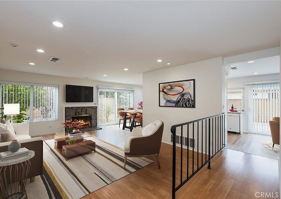 Nestled in a quiet neighborhood, this clean, bright and open 4 bed / 2 plus a half bath home (approx 1872 sqft per Assessor) exudes a sense of warmth, stability and pride of ownership! The inviting, open floorplan with wood laminate flooring throughout draws you inside through the double door entry. The handsome fireplace in the bright living room is a warm focal point and the perfect spot to gather with family and friends or read a book, snuggled in a blanket on a crisp weekend. The formal living room wraps around the fireplace and opens into the formal dining room which flows directly into the remodeled kitchen. The bright and airy kitchen is a warm welcome after a busy day at work and the great room layout with ample space for an informal dining table and additional space for the family to unwind is the perfect spot to cook, monitor homework or for family movie night. The stairs are tucked away off of the family room and downstairs powder room for guests. Follow the stairway up to a long hallway leading to the primary bedroom with remodeled private bath, three additional bedrooms, all with vaulted ceilings and the full shared bath. The tall ceilings and spacious rooms are a pleasant surprise, each room privately situated above the common living/entertaining areas. Don't miss the patio area as you walk out of the sliding glass doors from the kitchen. You'll be mesmerized and amazed by the "orchard" and variety of fruit trees (mango, guava, grapefruit, orange, lemon and lime) that would be a delightful back drop for the dining room. The location is ideal with quick access to the 405, 110 and 91 freeways, close proximity to CSU Domiguez Hills and a stone's throw from Ikea, Target, restaurants and the South Bay Pavillion. Make this lovely home your FOREVER HOME...