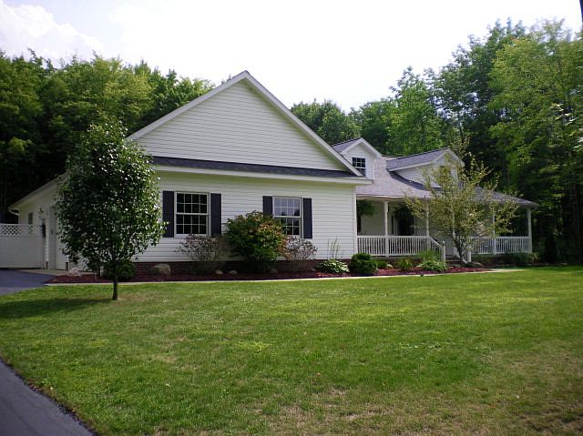 This exquisite ranch home is situated on a peaceful double lot (trees) on the edge of town. You can't mistake the quality features: fully-applianced custom oak kitchen w/island, double oven, granite counters & heated tile floor all overlooking great room w/ gas fireplace. Comfortable master suite w/walk-in closet, custom built-ins, private bath w/step-up jetted tub & unique tiled shower. In addition you have 2 car attached & 3-car detached garages with oversized doors & one ideally laid out for that private "mancave" he has dreamed about. House has all the bells and whistles and more!