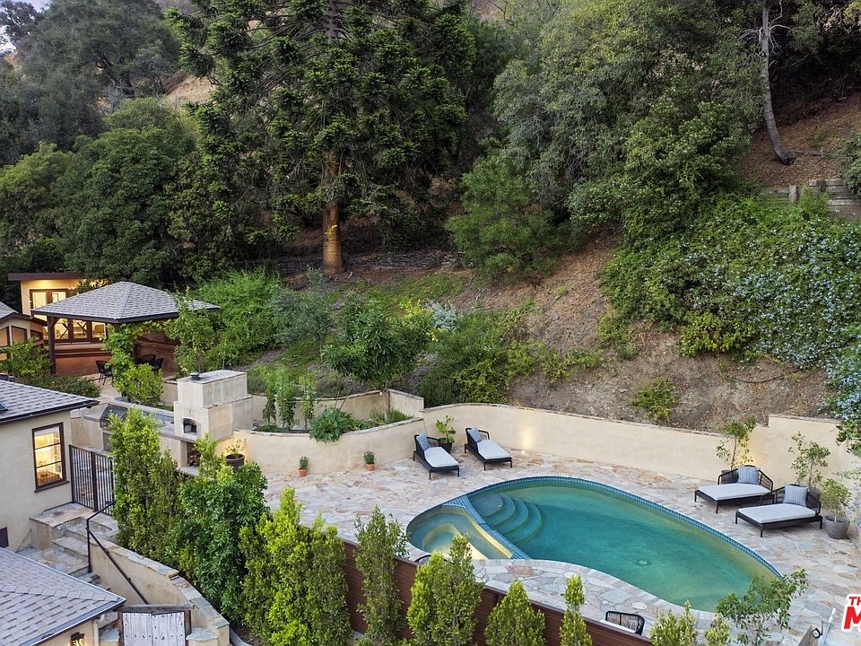 Privacy and serenity surround you in this beautifully updated 4 bedrooms, 3.5 bath home, set back from the street and tucked away on a secluded lot surrounded by lush landscaping. With its resort style salt-water pool & spa, multiple lounging areas, separate grassy yard, romantic canopied outdoor dining, fire-pit, outdoor kitchen, vegetable garden and pizza oven imported from Italy, you'll feel in vacation mode all year long. On the main level: a formal living room with fireplace opens to the dining room and the flow continues into the impeccably designed kitchen, oversized center island and lovely breakfast area with a second fireplace. This level is completed by 2 bedrooms separated by a full bath and a light filled primary bedroom suite leading to a stunning bath with heated floor and a huge closet. On the lower level: a large 4th bedroom with separate entrance, currently set-up as a den, a full bath, a wine cellar for approx. 750 bottles and several storage areas. A detached studio with peaceful canyon views is ideal as a separate office or gym. Entertaining is a breeze with plenty of room to park on site. The property has been updated with solar panels, a back-up generator, tankless water heaters and an EV charger. Located just minutes away from Beverly Hills and its world-famous shopping, dining, and entertainment!