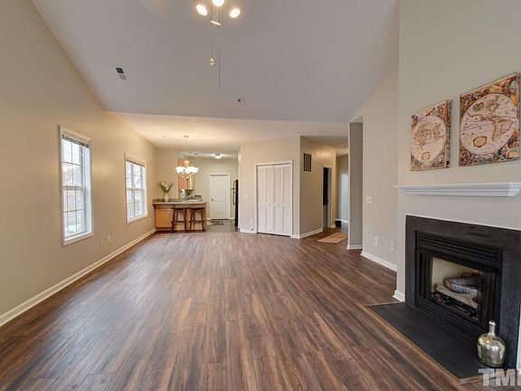 BACK ON MARKET...2 Bed 2 Bath End Unit backs to Greenway & Comm Park. NEW Paint & Laminate floors. NEW HVAC & ROOF! Bright Open Split BR plan w/Ceiling fans thru-out. Vaulted Ceilings. Gas FP. NEW Light Fixtures/Faucets. Highly Desirable area w/Shopping, Dining, Rec in walking distance. Close to RDU/RTP. The newest Wegmans is 1 Mile away. Hatcher Crk Greenway will connect to Crabtree Creek GW this summer...an easy walk/bike ride to Lake Crabtree. HOA includes Pool, Basic Cable, Water. 1yr Home Warranty.