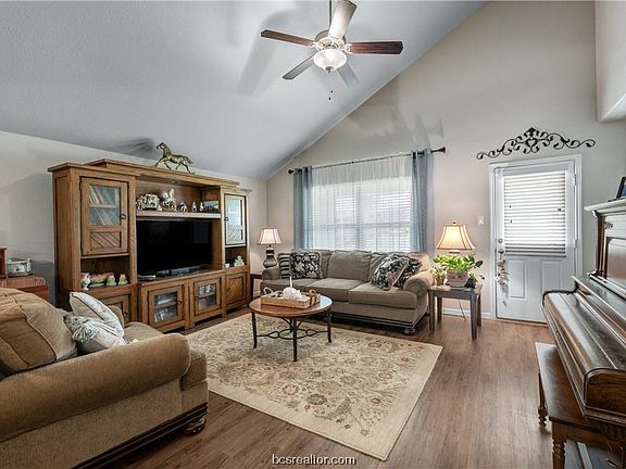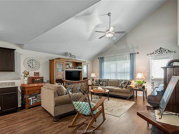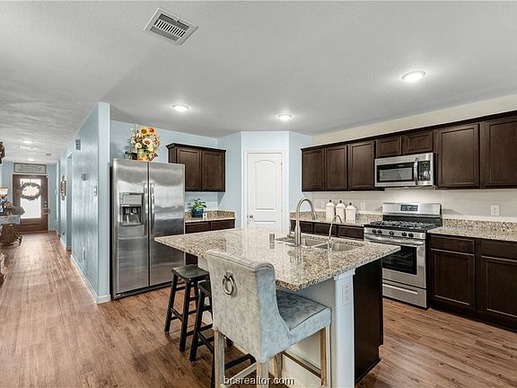 Beautifully maintained 4 BD / 2 BA home in sought-after Pecan Lakes Estates in Navasota. This golf course community is centrally located with easy access to Bryan/College Station, Brenham, Historic Downtown Navasota, and Houston. Island kitchen with eating bar, granite countertops, and gas range. 3 bedrooms share access to a hallway bathroom. Primary suite is situated at the back of the home with its own bathroom that features separate soaking tub and shower and two sinks. Vinyl wood plank flooring throughout the home with carpet in the bedrooms. Open floorplan with dining and kitchen open to the living area that has soaring ceilings! Three car garage with plenty of room for additional storage, golf cart, or hobbies! This home is situated on one of the larger lots in the subdivision and a covered back patio that is ideal for entertaining outdoors. Golf course and community pool/clubhouse available for use with a Pecan Lakes membership fee.