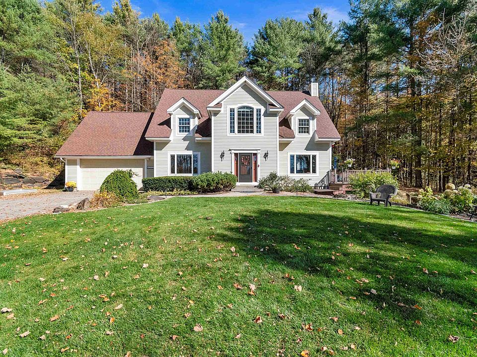 Nestled on 5.6 acres, this inviting home offers the perfect blend of country charm & modern comfort in a stunning Vermont setting! With partial mountain views in summer and full, sweeping views in winter, you'll enjoy year-round natural beauty. A welcoming entryway greets you with double closets for ample storage. The open-concept main living area features soaring cathedral ceilings and large windows that fill the space with light. A cozy propane stove with a stylish tile surround anchors the great room, subtly dividing the spacious living and dining areas while creating a perfect spot to gather. The kitchen is a standout with white cabinetry, stainless steel appliances, tile backsplash and a peninsula with bar-height seating for five. A sliding door in the dining room opens to the expansive wrap-around deck—ideal for outdoor dining, entertaining, or simply taking in the peaceful surroundings. Two bedrooms, a ¾ bath & convenient laundry room complete the main level. Upstairs, the large primary suite offers a quiet retreat with a deep walk-in closet and en suite bathroom featuring an air-jetted soaking tub. The second floor also includes two open flex spaces overlooking the main living area below. Outside, enjoy a thoughtfully landscaped yard with mature trees, stonework accents, trails through the woods and plenty of space for gardens. The deck wraps around two sides of the home, offering multiple vantage points to enjoy the tranquil surroundings and stunning views!