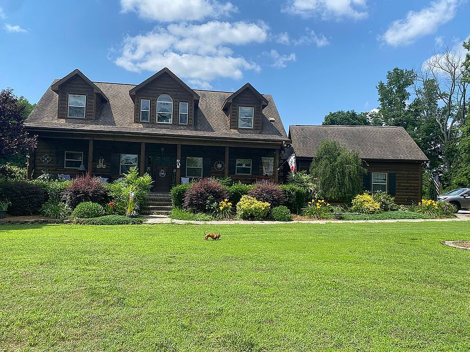 Log home with open floor plan, large eat in kitchen with, dining & island, walk-in pantry. Laundry room access from garage. Half bathroom off entry way. Master bedroom /bath on main floor. Loft with 2 bedrooms (each with walk-in closet), full bathroom . 2 car garage. Large pond out front. Work garage on property 30x50ft.