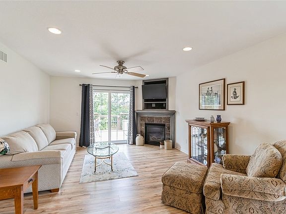 Better than new Bi-attached walkout Ranch with no dues! New flooring throughout including LVP and carpet plus newer interior paint. First floor includes kitchen with stainless steel appliances, a pantry, tons of cabinets, breakfast bar island, AND a spacious family room with corner stone fireplace and sliders to the lg deck (with new stairs). Primary bedroom has an updated bath with a walk- in-shower and barn door. Laundry is located off the primary bedroom. Finished lower level features two additional bedrooms, full bath and tons of storage. Oversized two car garage with built in work bench, remote blinds on main level, and a new roof in 2022. Backyard has a concrete slab for furniture and a small vegetable garden. Conveniently located close to the new Fareway and walking distance to schools.