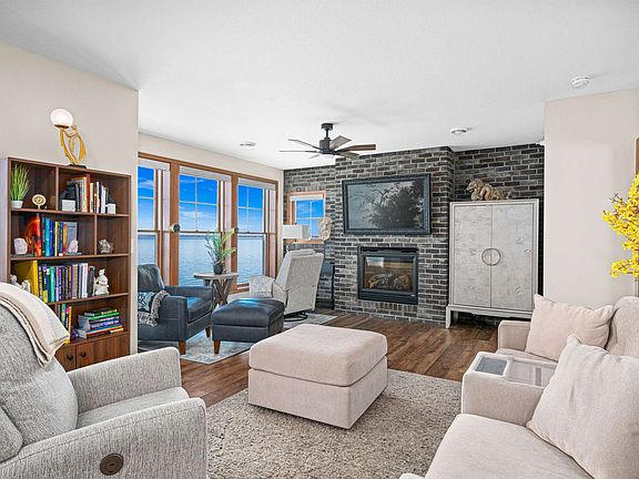 Panoramic viewsBreakfast barNew brick fireplace facadeDeck overlooking the lakeOpen floor planCustom glass doorsRelax in comfort