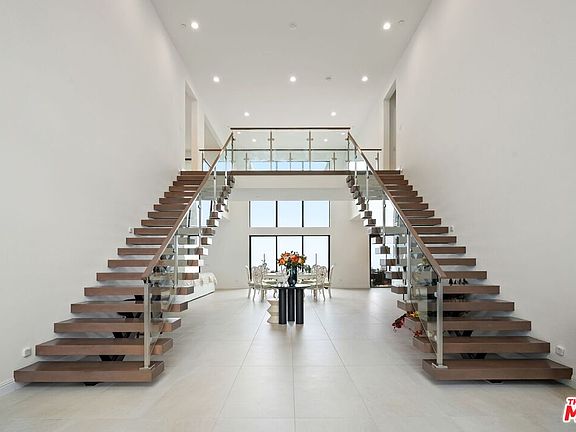Welcome to this truly magnificent estate, nestled in the prestigious, guard-gated Westcliffe community of Porter Ranch. Showcasing the highly sought-after Pacific floor plan from the elite Skyline Collection, this 5,567 sq ft residence offers an exceptional blend of modern luxury, timeless design, and functionality. The home features 5 spacious bedrooms, 5.5 elegantly appointed bathrooms, a large upstairs loft oversized balcony, dual garages, and a highly desirable private Gen Suite on the main level, ideal for multigenerational living or guest accommodations, includes private access to exterior. From the moment you step through the oversized front door, you're welcomed by grand dual floating staircases and a striking double-height foyer. The expansive great room is flooded with natural light from floor-to-ceiling windows and seamlessly connects to the outdoors, making it perfect for both relaxing and entertaining. At the heart of the home is a true chef's dream: a gourmet kitchen with custom marble countertops and backsplash, premium Sub-Zero and Wolf appliances, a large eat-in center island and gorgeous tile floors throughout. As an added bonus, the home also includes a fully equipped prep kitchen, offering a second space for cooking, hosting, or catering an entertainer's dream. Upstairs, the luxurious primary suite features a private retreat, a massive custom walk-in closet, and a spa-inspired en-suite bathroom with high-end finishes. Situated on an oversized flat lot with a sprawling wraparound backyard, the home offers breathtaking city and mountain views and a rare oversized driveway. Additional highlights include solar panels and expansive glass sliders for seamless indoor-outdoor living. Located just minutes from top-rated schools, the 118 freeway, and the highly acclaimed Vineyards shopping center home to Whole Foods, Nordstrom Rack, AMC Luxury Cinemas, fine dining, and morethis estate delivers the pinnacle of upscale Southern California living.