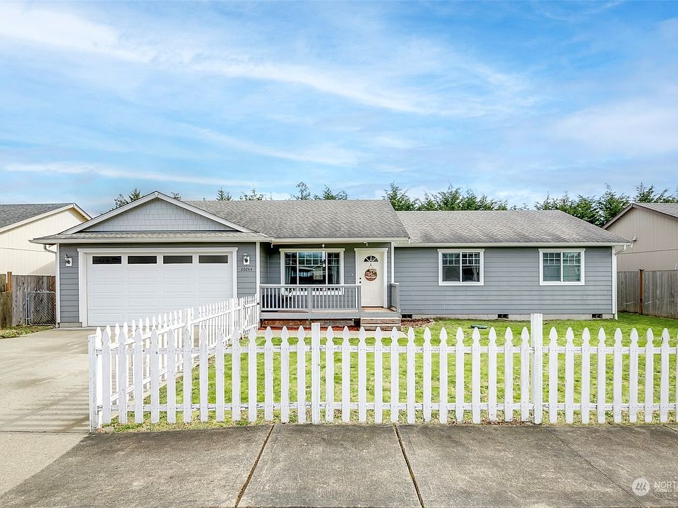 Fall in love w/ this beautiful 3 bed ,2 bath rambler featuring a covered front porch overlooking the fully fenced front yard w/ fresh landscaping ensuring optimal exterior charm! Step inside to discover a generous open-concept design connecting the spacious living area, kitchen w/ stunning espresso cabinets & access to the back patio; creating an inviting atmosphere perfect for entertaining! This home offers newly installed trim, freshly painted doors, oversized utility room & more! Feel the crisp cool air of the heat pump, enhancing the appeal & functionality of your home for hot summer days ahead! Primary bedroom reveals a private en-suite bath & large walk-in closet. Conveniently located near I-5, schools, shopping & Great Wolf Lodge.