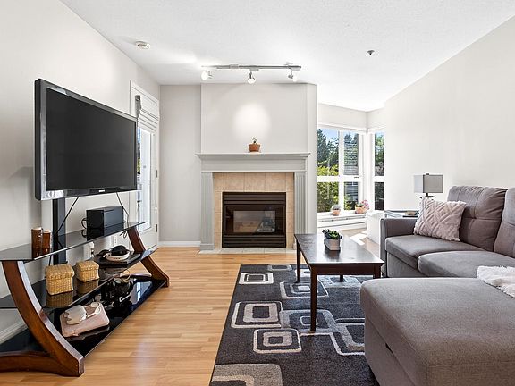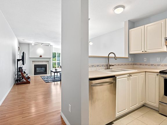 Welcome Home! Imagine stepping into your move-in-ready 1-bedroom haven thats bright, cheery, and tastefully updated with fresh paint, new kitchen tiles, laminate floors, and stainless steel appliances. Enjoy the cheater ensuite, in-suite laundry, and ample storage. Unwind on the massive south-facing patio. Prime location: stroll to future SkyTrain (close yet quiet), shopping, parks, and trails. Healthy strata in a welcoming building with extra street parking. Maintenance covers gas fireplace. Pet-friendly, no age restrictions—best value at 752 sq ft! Won't last—act fast!