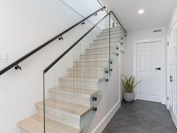 Designer kitchenCustom cabinetsHigh-end appliancesWhite oak laminateGlass railingsHerringbone tile entryFlexible basement suite