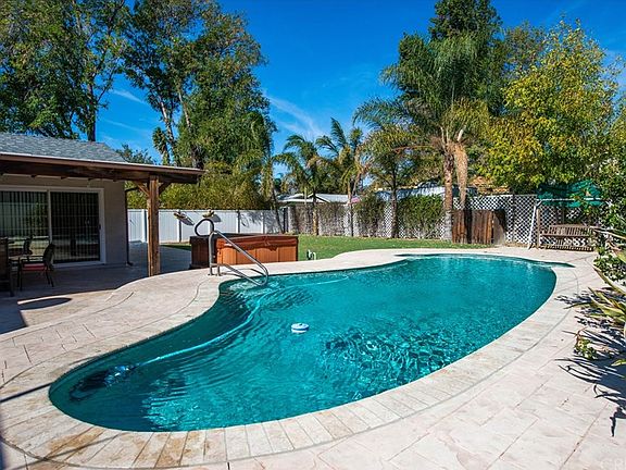 Charming Chatsworth Pool Home On A Corner Lot! Immaculately landscaped front yard with a mature shade tree on a sweeping corner lot. Spacious living room. Kitchen with a dining area and lots of cabinet and counter space. Refrigerator included. Slider from kitchen leads to back patio. Three spacious bedrooms, one with a slider leading to the back yard. Two updated bathrooms - the full bath was remodeled just this year with contemporary finishes. Wood style laminate and tile floors throughout. Dual pane windows and sliders. Gorgeous backyard with stamped concrete hardscape, drought resistant landscaping, including a spacious artificial turf lawn area. Sparkling swimming pool redone in Pebble Tec less than 2 years ago. Above ground spa recently tuned up with new hardware, new pads, and new cover. Deep covered patio - perfect for outdoor dining and relaxing. Great flow inside and out for entertaining. Spacious 2 car garage. Extra wide driveway and room on the side of the house for additional parking - good RV/trailer potential here. Newer roof, less than 2 years old. Newer HVAC system and ducting, less than 2 years old. Prime Chatsworth location - close to schools, park, and shopping.
