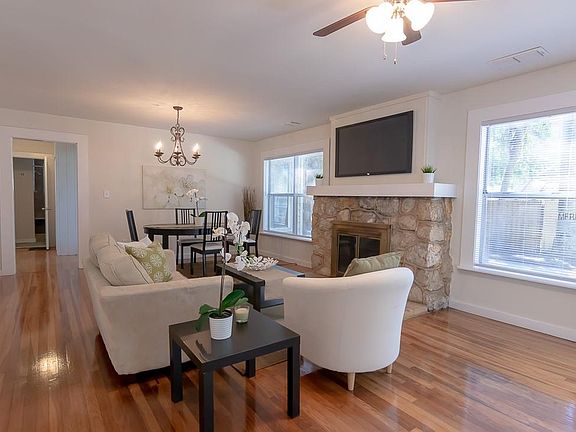 Beautifully restored 3bed/2ba with large detached garage! Hurry to see this home that features original charm with modern updates. This large .30acre corner lot offers an open floor plan with restored Pine Flooring through much of the house along with new vinyl flooring. The master bedroom sits right off the living room with it's own bathroom with tub/shower. The kitchen has been completely redone with new cabinets, stainless steel appliances and granite counters. Off the kitchen is an enclosed utility/laundry room with access to your large lanai that is screened with wood decking. The living room features a wood burning fireplace. Throughout the home are new fixtures, new outlets, fresh paint inside and out. Roof permitted in 2007. The detached garage offers many options such as an apartment conversion with a side carport and two bay enclosed garage. There is a small workshop on left side of garage with walk-in closet space and the right side offers ample space for parking your vehicle. This property is located within the Bradenton City limits and is minutes to downtown, the Riverwalk, shopping, restaurants and a short 15-20min drive to the beach!