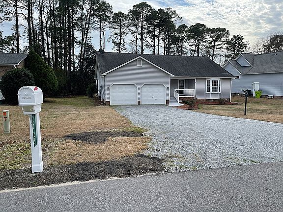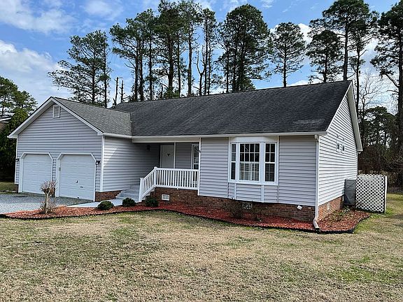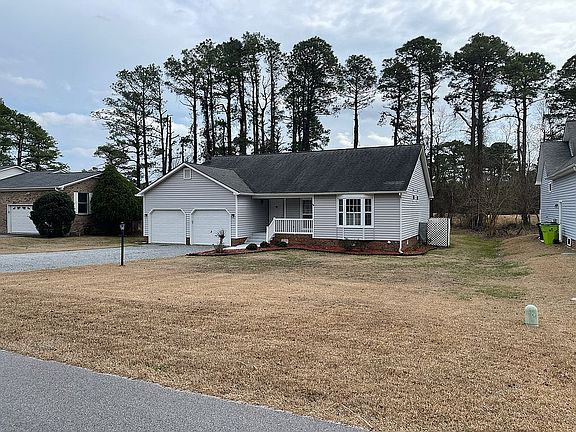 Single family, single story home. Gray vinyl siding. Two car garage. Vinyl flooring throughout. Recently updated with new appliances, countertops, backsplash, cabinets, freshly painted throughout. Double hung vinyl windows. Heat pump/HVAC unit. New electric hot water heater. Eat-in kitchen/breakfast nook and dining room. Large family/living/main room with wood fireplace. Many closets. Onsite well. Big back yard with views of green space; steps from walking/biking/golf cart path. In gated community. Near dog park, playground, pickleball court and water access as well as marinas, 18 hole golf course, boat ramps, kayak launches, fishing pier, and recreation center with pool and tennis. Access to Neuse River.