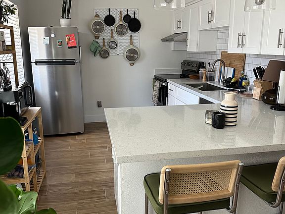 Step inside, and you'll immediately be greeted by an abundance of natural light and stunning luxury vinyl flooring throughout the home. The kitchen is perfect for creating culinary delights, featuring stainless-steel appliances, a sleek stove vent hood, and timeless white shaker cabinets. The classic subway tile backsplash and elegant quartz countertops add to the charm, while the peninsula with a breakfast bar provides the ideal space for casual dining or entertaining. This home has been thoughtfully designed with modern conveniences, including brushed nickel fixtures and Cat6 Ethernet wiring for a seamless work-from-home setup. The property also includes a designated covered parking spot, making your daily routine hassle-free. Plus, enjoy the added convenience of a coinless washer and dryer onsite. Living here means enjoying a vibrant and friendly community, all while being within walking distance to popular local restaurants and coffee shops. It's ideally located near downtown Phoenix, providing easy access to ASU, NAU, Banner University Medical Center, Phoenix Children's Hospital, St. Joseph's Medical Center, and Sky Harbor Airport. With major freeways nearby, you're always just minutes away from wherever you need to be.