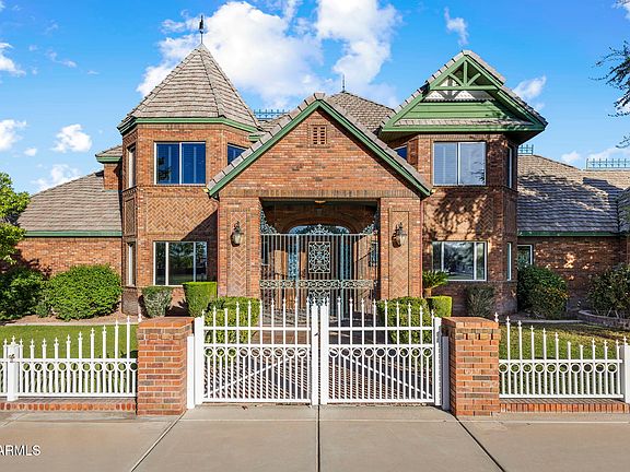 Where timeless elegance meets Arizona heritage — this iconic Victorian-inspired estate rests on 5.66 irrigated acres in the heart of Gilbert, offering an unmatched blend of luxury, privacy, and equestrian living just minutes from vibrant Downtown Gilbert and SanTan Village. Spanning 6,831 sq ft with 5 bedrooms and 7 bathrooms, the home showcases 12' ceilings, a sweeping grand staircase, stained glass details, and handcrafted millwork throughout. The main-level primary suite features dual walk-in closets, while the fully finished basement includes a kitchenette, full bath, and generous storage. Step outside to a resort-style pool, lush irrigated grounds, multiple covered patios, and full equestrian amenities including a 36×64 shop, hay barn, and stalls. With no HOA, a private gated entrance, and room to roam, this Gilbert landmark offers elegance, freedom, and legacy living. If privacy, history, and horses are your love language, welcome home.
