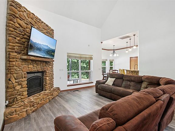 A stone fireplace sets the tone in the living area, while the front flex room easily serves as a home office or formal dining space.