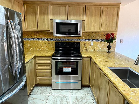 kitchen appliances including microwave and dishwasher, Refrigerator and Cooking range. Quartz countertops.