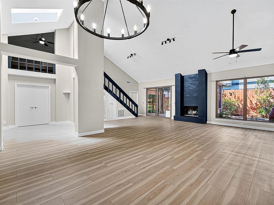 Cozy fireplaceHard flooringGenerous outdoor spaceThree spacious bedroomsBright skylightElegant formal dining areaSoaring vaulted ceilings