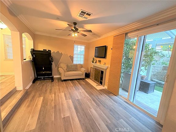 Gorgeous freestanding Mediterranean style townhome - Looks and feels like a single family residence. This home offers so much. On the first level... Open concept living room, dining room and kitchen. The Living room has a beautiful fireplace focal point, crown molding and a sliding door that opens to the wonderful back yard. Most of the first level has brand new wood look flooring. The kitchen is a chefs dream. White cabinetry, granite counters, stainless steel appliances, custom lighting and a peninsula bar area. Cook and be a part of the party. Direct access to the 2 car garage. A Pretty powder room near the staircase. Upstairs... An amazing space. The Bonus/family room or 4 th Bedroom ( if you add a wall and closet) so versatile. A huge skylight makes the room so inviting and bright. Double doors open to the Main Suite. This Bedroom is HUGE with high ceilings, a walk in closet and a private bathroom. Enjoy dual vanities, a soaking tub, Toilet room and a shower. Travertine stone tile is used extensively here, a classic style. The other two bedrooms and bathroom are across the bonus area for added privacy. Convenient upstairs laundry room. The back yard features a covered patio, new vinyl fencing, Artificial grass, a vegetable garden and a butterfly attracting garden, Lovely space for the family to gather and entertain. There is a new FAU and AC unit with an air filter and smart thermometer. Designer paint and touches throughout the house. Don't miss out.