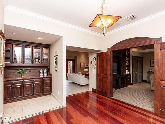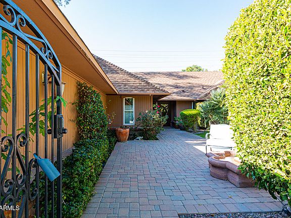 Nestled in the exclusive Bartlett Estates of Biltmore, this 2,306 sq ft, 2-bed, 2-bath executive retreat offers privacy and luxury in the heart of Phoenix's financial district. The gourmet kitchen boasts top-tier KitchenAid appliances, including a built-in fridge, wine fridge, warming drawer, microwave, and Electrolux range. Traditional charm is evident in the Brazilian Cherry hardwood floors, custom wood trim, and doors. Enjoy expansive patios on all four sides, with access from the living room, family room, master bedroom, and entryway—each leading to fountains or the resurfaced Pebble Tec pool. The spacious master suite features a fireplace, luxury bath, and walk-in closet with organizers. 2 Car Garage offers Epoxy floors and Storage Cabinets. 3rd bed is being used as Family Room. Meticulously maintained and extensive updates throughout. The Larger HVAC is ~12 years old and rarely used, it covers the front of the home. The smaller unit is ~5 years olden covers the back bedrooms and baths, both are serviced regularly. The pool was resurfaced in 2021 along pump and cleaner. The family room could easily be a 3rd bedroom, office, den or play room. It would need doors, but has a closet. This home boasts 4 patio areas on each side of the home and its nearly 1/4 acre lot. As you enter through the front gate, there is a nice grassy area with Paver Patio next to a fountain. This is the east patio. Off the master is Pool area with lots of patio space and on the north. The living room and dining room open to a lovely covered patio with pavers and fountain. Lastly, the west patio is off the Family Room offering fountain and fruit trees (3 ornamental orange, 1 navel orange and 2 lemons). This home offers fabulous indoor and outdoor living!