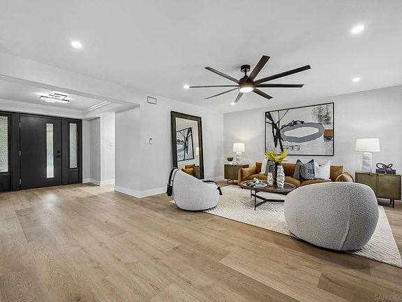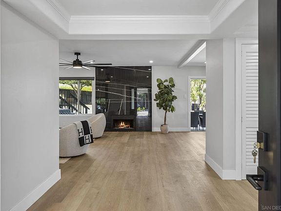 Located in Oceanside’s highly desirable Fire Mountain neighborhood, this fully remodeled 4-bed + theater, 3-bath home spans 2,370 sqft & offers modern luxury with thoughtful upgrades. The open floor plan features light oak luxury vinyl plank flooring, smooth-finish walls, & an 8-ft tiled fireplace. Natural light pours through new dual-pane windows with motorized blinds, complemented by recessed & modern lighting throughout. The designer kitchen boasts quartz countertops with a waterfall edge, full quartz backsplash, breakfast nook, & new appliances, including a dishwasher, stove, fridge, hood vent, pot filler, & wine fridge. The primary suite offers a private tiled fireplace, shiplapped vaulted ceilings, and a spa-inspired ensuite with large format tile, soaking tub, curbless shower, modern vanity with LED mirrors, & custom closet. Two additional baths feature book-matched tile showers, new vanities, & LED mirrors. Enjoy movie nights in the dedicated theater room with a large TV & built-in speakers. Outside, relax on the upgraded balcony, private front wood deck, or spacious backyard with new turf & putting green, updated fencing, & black mulch landscaping. No detail is overlooked, with a new sandblasted stucco exterior, roof, eaves, gutters, & a finished 2-car garage with metallic epoxy floors and modern glass doors. Additional upgrades include new solid-core shaker doors throughout, new washer/dryer, outlets/switches, & fully paid-off solar. Ideally located near shops, restaurants, freeways & beaches, this home offers the perfect blend of style & convenience. No HOAnull