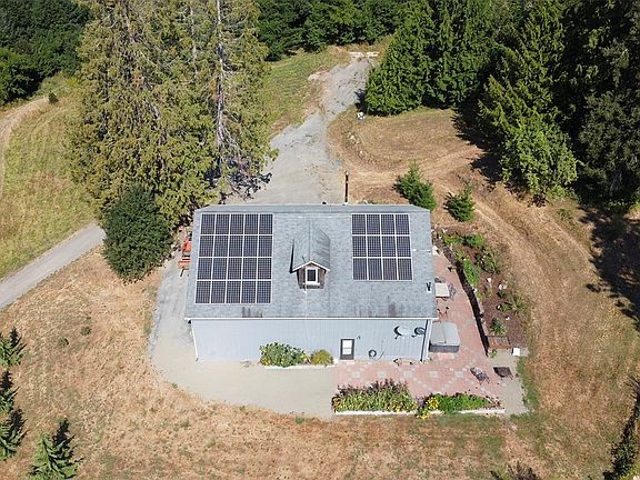 1800 sq ft with a 1273 sqft attached garage on 6 acres. 12x14 shop doors, air compressor stays. Energy efficient solar panels on roof, individual well, & septic. Exterior painted in 2021 w/UV paint. Patio w/hot tub & garden space, plus a fenced garden area. 2 RV dump sites, wired for generator, Leafguard gutters, 26x51 metal carport also included. Sellers were planning on building on the property, call for details.