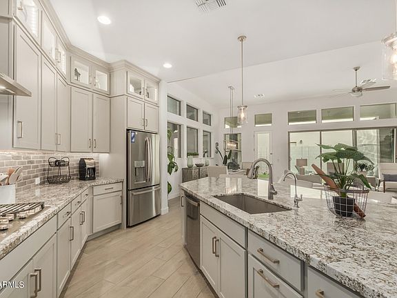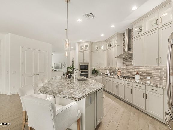 Beautiful David Weekley Chatman model corner lot, with wrap around front porch, located less than a block from Community Center and around the corner from the school. 12-foot ceilings, 8-foot doors and a 12 foot multi stack slider that opens the great room to the outdoor covered patio. Granite countertops with a giant kitchen island that has under-mounted lighting as well as under-cabinet lighting on back wall, and glass cabinets at ceiling. RO system. Ceiling fans in all rooms with plank tile flooring throughout except bedrooms, which have carpet. Fully landscaped with synthetic grass front and back. A three-car tandem garage. Gas stove with stainless steel hood vent, built in microwave, and wall-mounted electric oven. 5-inch baseboards and brush nickel fixtures and hardware. Master bedroom has a super shower with additional rain head. Large walk-in closet. Security camera system, Ring Doorbell, cable and fiber optic hook ups. Homeowners paid an additional fee for a corner lot pop-out structure, adding 23 ft.² to the home for a total of 2414 sq ft. (not currently reflected in tax records).
