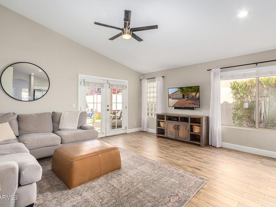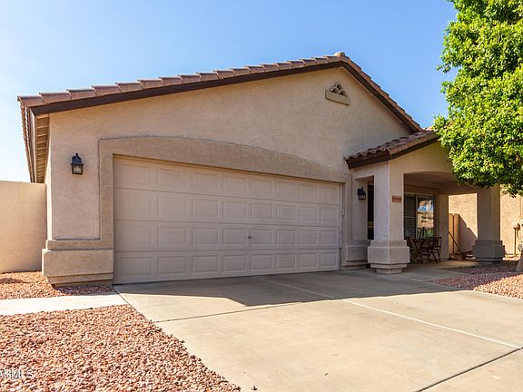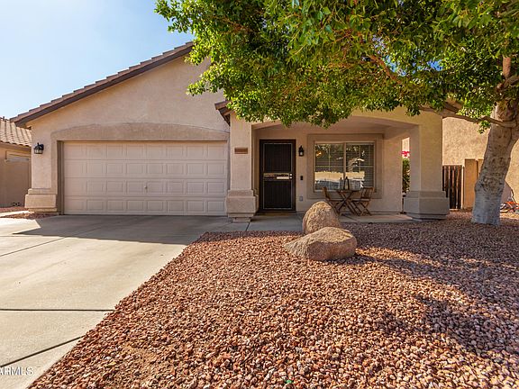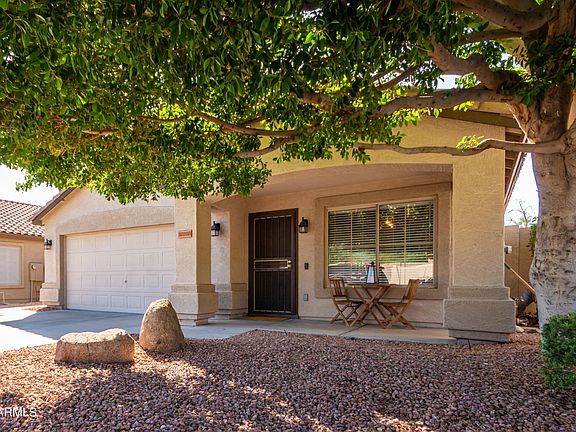 Welcome to this beautiful home in Sierra Verde at Arrowhead Ranch! Displaying a front porch, mature landscape, & a 2-car garage. Fabulous interior features vaulted ceilings, tons of natural light, chic light fixtures, a designer palette, and wood-look tile flooring w/carpet in bedrooms. You'll love the formal living & dining room, perfect for receiving guests! The impressive kitchen has SS appliances, mosaic tile backsplash, quartz counters, an island, and ample white cabinetry. Its 2-tier peninsula overlooks the inviting family room for a great room effect! French doors merge the inside/outside activities. Large main bedroom boasts an ensuite with dual sinks & a separate tub/shower. Discover the backyard's grassy area & extended covered patio to relax! NO neighbors behind! Make it yours!