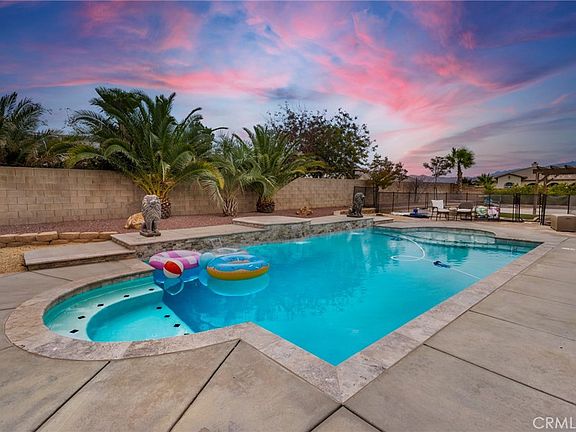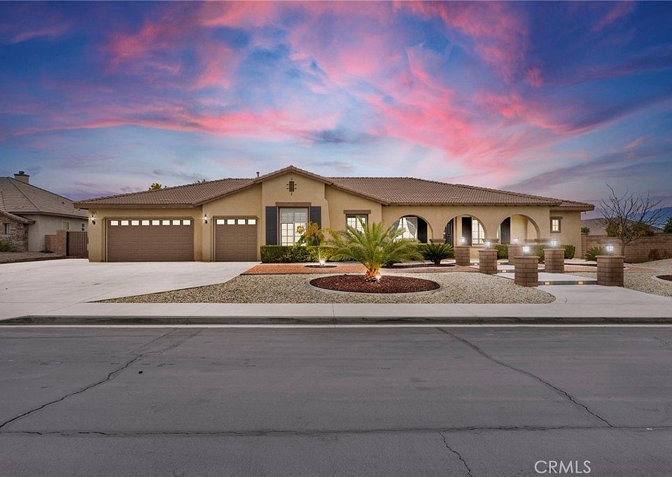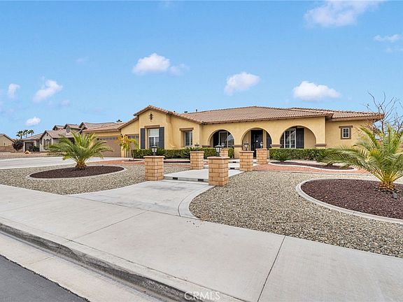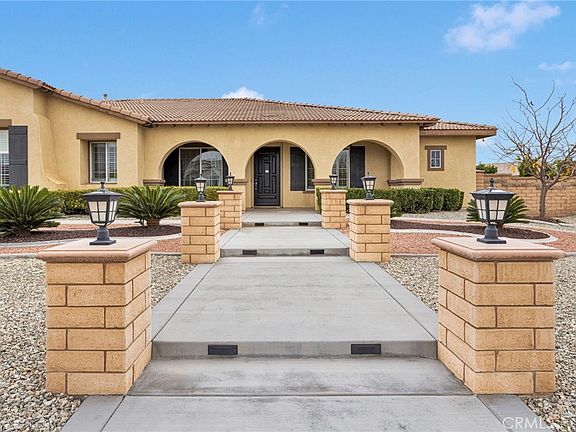 Welcome to Fuji Court, a retreat-like home in the gated Veranda community. With 3,184 sq ft of living space, 4 bedrooms, an office/bonus room, and 2.5 baths this home is designed for refined comfort and easy living. Beautiful curb appeal and landscape lighting highlights the architecture & mature plantings. Inside, tall ceilings and large windows bring natural light into every room. The layout includes a formal living room, formal dining, and a spacious family room with fireplace, built-in wine bar, and expansive views that extend living space into the stunning backyard. The remodeled chef’s kitchen features white cabinetry, quartz countertops, a large island, Carrara marble backsplash, double smart ovens, walk-in pantry, coffee bar, and included refrigerator. The kitchen flows seamlessly to the family room where cooking, conversation and everyday living come together. The owner's suite offers a luxurious place to unwind and a spacious ensuite bath with dual sinks, makeup vanity, jetted soaking tub, and a large walk-in closet with built-in organization. Three additional generously sized bedrooms plus a bonus room that works well as a 5th bedroom, media room or home office. Set on nearly a half-acre corner lot, the backyard is designed for relaxation & recreation. Gated RV parking and extensive concrete work lead to a backyard built for year-round enjoyment. The large under-truss patio offers recessed lighting, ceiling fans and TV mounts. A swimming pool with a sunning ledge, raised waterfalls, tanning deck, & safety fencing creates a private resort feel. A wood gazebo, firepit and included playground equipment add flexible spaces for gathering & outdoor play. Synthetic turf, stonework and concrete finishes are easy care for more time to enjoy the setting. The finished 4-car garage includes epoxy flooring. Practical features include assumable SOLAR, Solar pool heater, 2 HVAC units, indoor laundry and a multi-camera security system. Thoughtfully updated, Fuji Court offers refined comfortable family living in The Verandas, one of Apple Valley’s most sought-after gated neighborhoods that is close to shopping, schools and dining.
