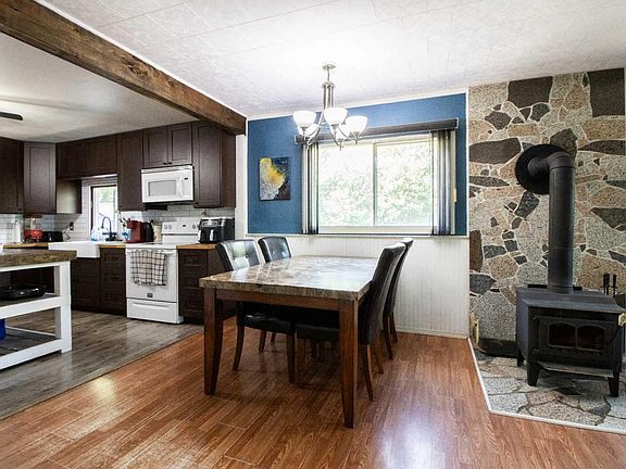 Mature hedges for privacyWest-facing front deckGenerous entry foyerOpen-concept dining areaUpdated kitchenRustic wood beamsWood-burning stove