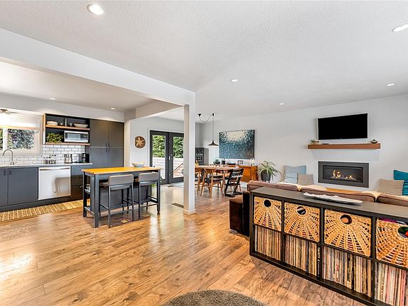 South facing backyardOpen concept kitchenCozy gas fireplaceLaminate wood flooringStainless steel appliancesStone countersOutdoor fire pit