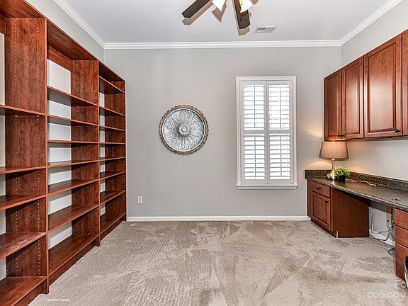 The perfect floorplan awaits you in the desirable subdivision of Calloway in Tega Cay! Enjoy maintenance free living in this one level home that has a view of the 8th Fairway, as well as trees for privacy! Open kitchen with breakfast bar, built- seating & large pantry. Primary suite with lots of light, trey ceiling, bay window and a view of the backyard will not disappoint. Spacious office, complete with desk and built-ins for your favorite books and mementos. Relax in the sunroom while you enjoy your morning coffee. Plantation Shutters throughout. The home's driveway has been expanded and a stamped concrete sidewalk leads you to the back yard where you can entertain on the expansive patio! Perfect for relaxing, bird watching or grilling! Finished room over the garage for more square feet.... Enjoy all that Tega Cay has to offer including walking trails, parks, lake access, golf and swimming.